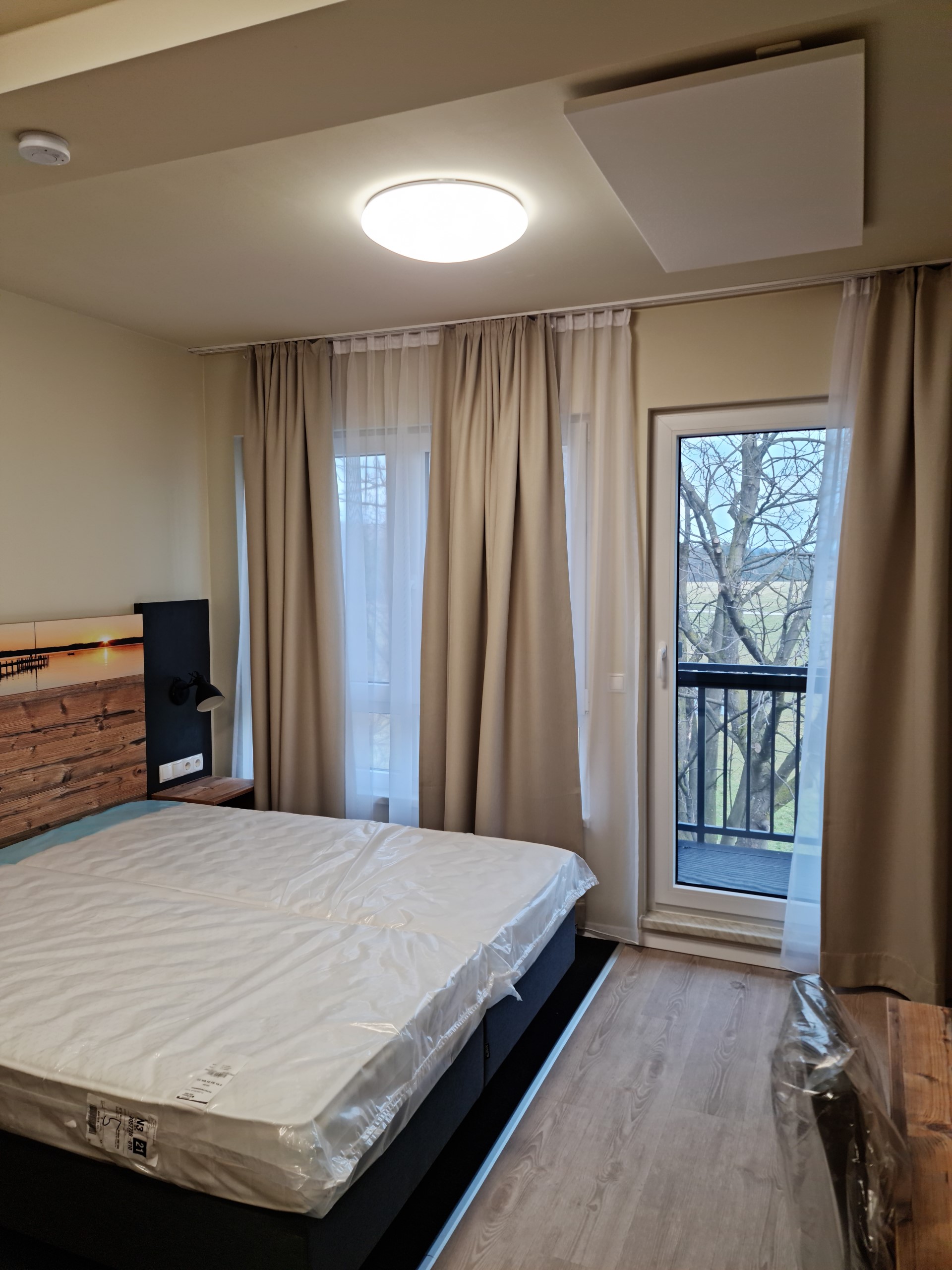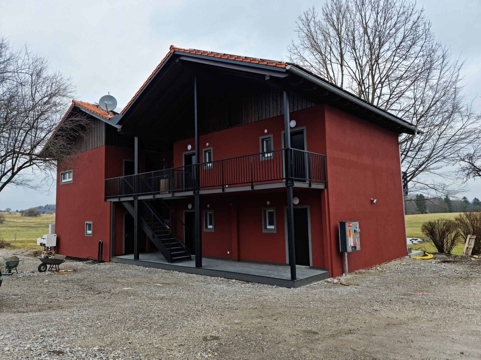 Erweiterung eines Landgasthofes mit Fremdenzimmern um einen zweigeschossigen Neubau in Modulbauweise mit 8 Zimmern. Die Pension ist nach den aktuellen Wärmedämm-Standards gebaut (angelehnt an KfW55) und verfügt zusätzlich über eine Photovoltaik Anlage mit Batteriespeicher sowie eine Zisterne zur Nutzung des Regenwassers z.B. für die Toilettenspülung. Um das Gebäude in die Umgebungsbebauung einzufügen hat es ein Satteldach und eine, an die Farben des bestehenden Gebäudes angepasste, rote Putzfassade. Alle Zimmer verfügen über eine Infrarotheizung, Klimaanlage, energieeffiziente LED-Beleuchtung und bodengleiche Duschen sowie eine Kitchenette. Den Gästen steht zusätzlich noch eine Gemeinschafts-Waschmaschine zur Verfügung.